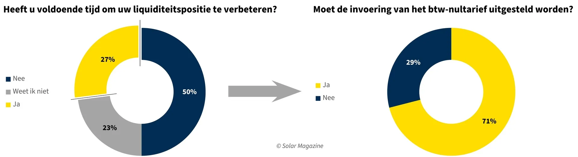 71 procent van de installatiebedrijven die stelt te weinig tijd te hebben om de liquiditeitspositie te verbeteren of dit nog niet te weten, vindt dat de invoering van het btw-nultarief moet worden uitgesteld. Dat alles blijkt uit een enquête van de redactie van Solar Magazine waaraan 212 installatiebedrijven hebben deelgenomen. 52 procent van hen vraagt de overheid het btw-nultarief later in te voeren.