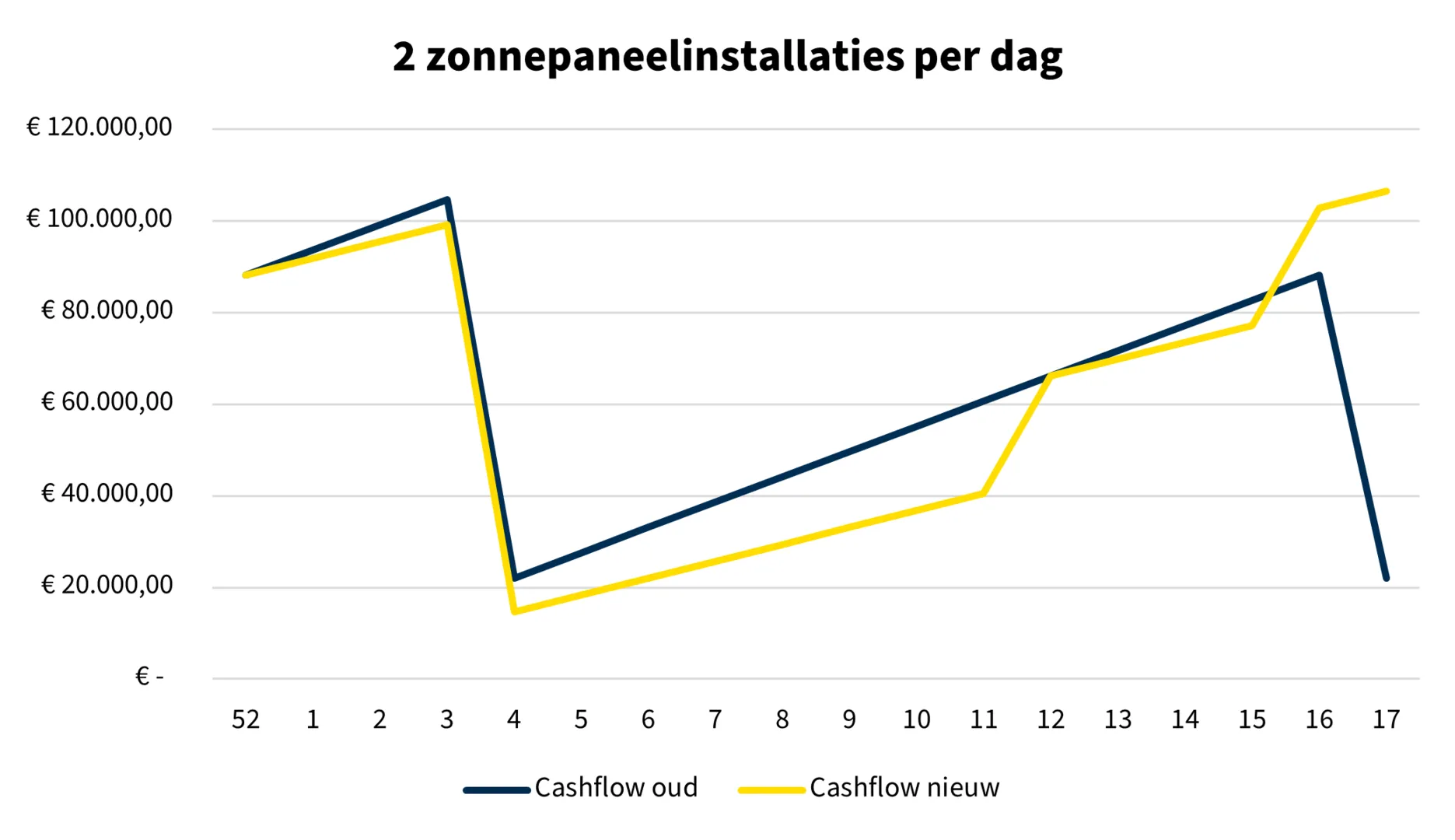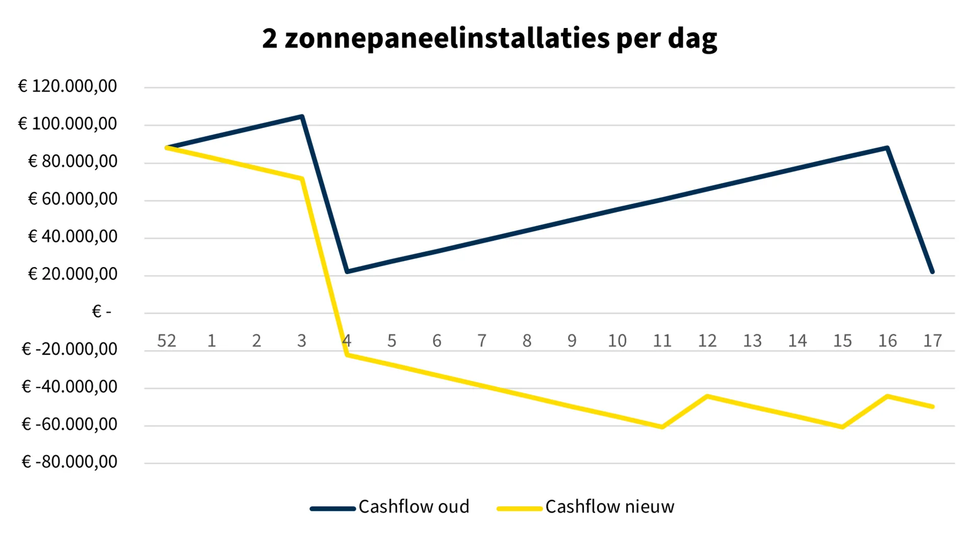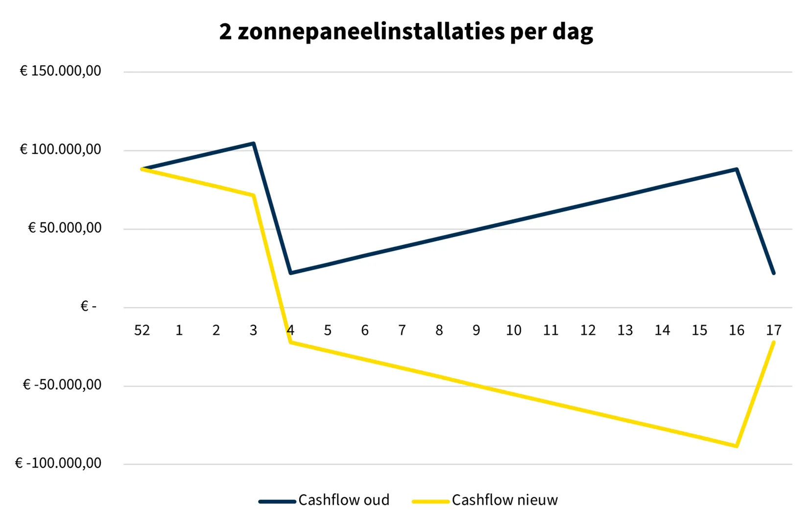 Hoe kan het btw-nultarief voor zonnepanelen de liquiditeitspositie van installateurs beïnvloeden? De Centrale bracht het in beeld voor een bedrijf dat 2 installaties per dag realiseert. Bij driemaandelijkse aangifte van omzetbelasting ligt het dieptepunt van de liquiditeitsbehoefte rond week 16 van 2023, zoals te zien in onderstaande grafiek.