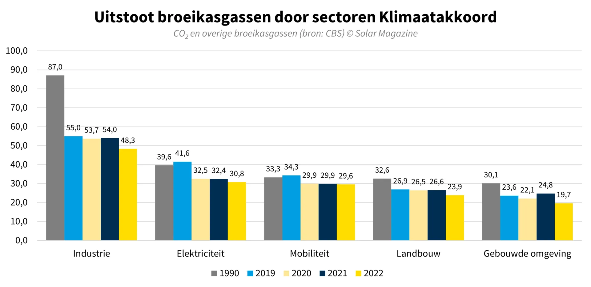 De industrie heeft 11 procent minder broeikasgassen uitgestoten. Ook dat wordt veroorzaakt door de hoge aardgasprijzen. Grote aardgasintensieve industriële bedrijven hebben hun productieprocessen hierop aangepast door minder aardgas te verbruiken of hebben hun productie deels stilgelegd. Het verbruik van steenkolen en aardolieproducten door de industrie is vrijwel gelijk- gebleven. De industrie heeft met 32 procent het grootste aandeel in de totale uitstoot van broeikasgassen. Ook de glastuinbouw heeft door hoge aardgasprijzen activiteiten deels stilgelegd of afgeschaald. Dit in combinatie met meer zonuren en gemiddeld hogere temperaturen in 2022 leidde tot minder aardgasverbruik in de glastuinbouw. Hierdoor was de uitstoot van broeikasgassen in de landbouw 10 procent lager.