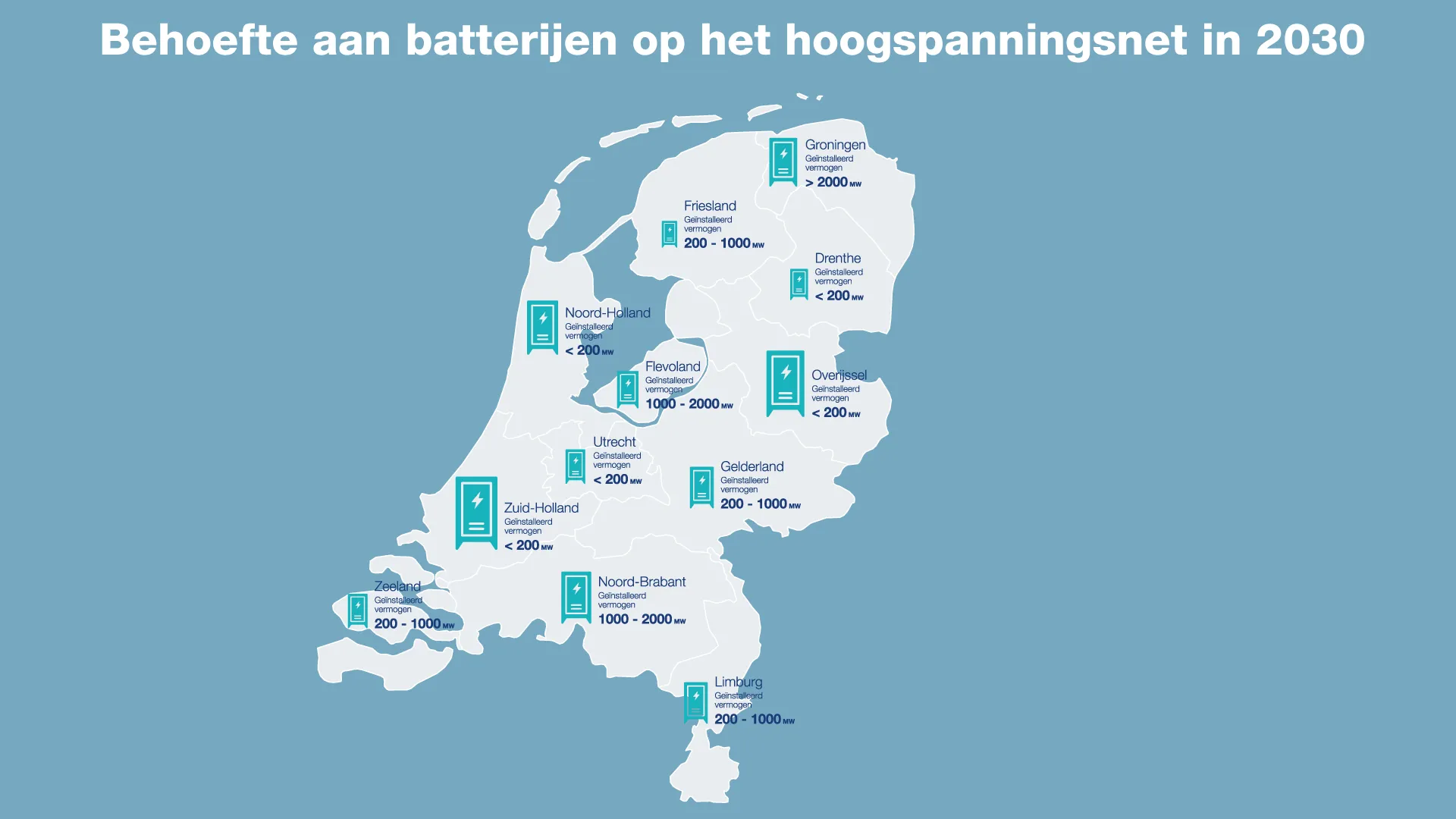 Met een kaart van Nederland geeft TenneT per provincie aan hoeveel opslagcapaciteit er straks nodig is voor systeemstabiliteit. TenneT doet de komende maanden nader onderzoek naar de praktische uitvoerbaarheid om deze opgave vorm te geven. De position paper is daarmee volgens de netbeheerder een eerste stap op weg naar grootschalige batterijcapaciteit in het elektriciteitsnet.