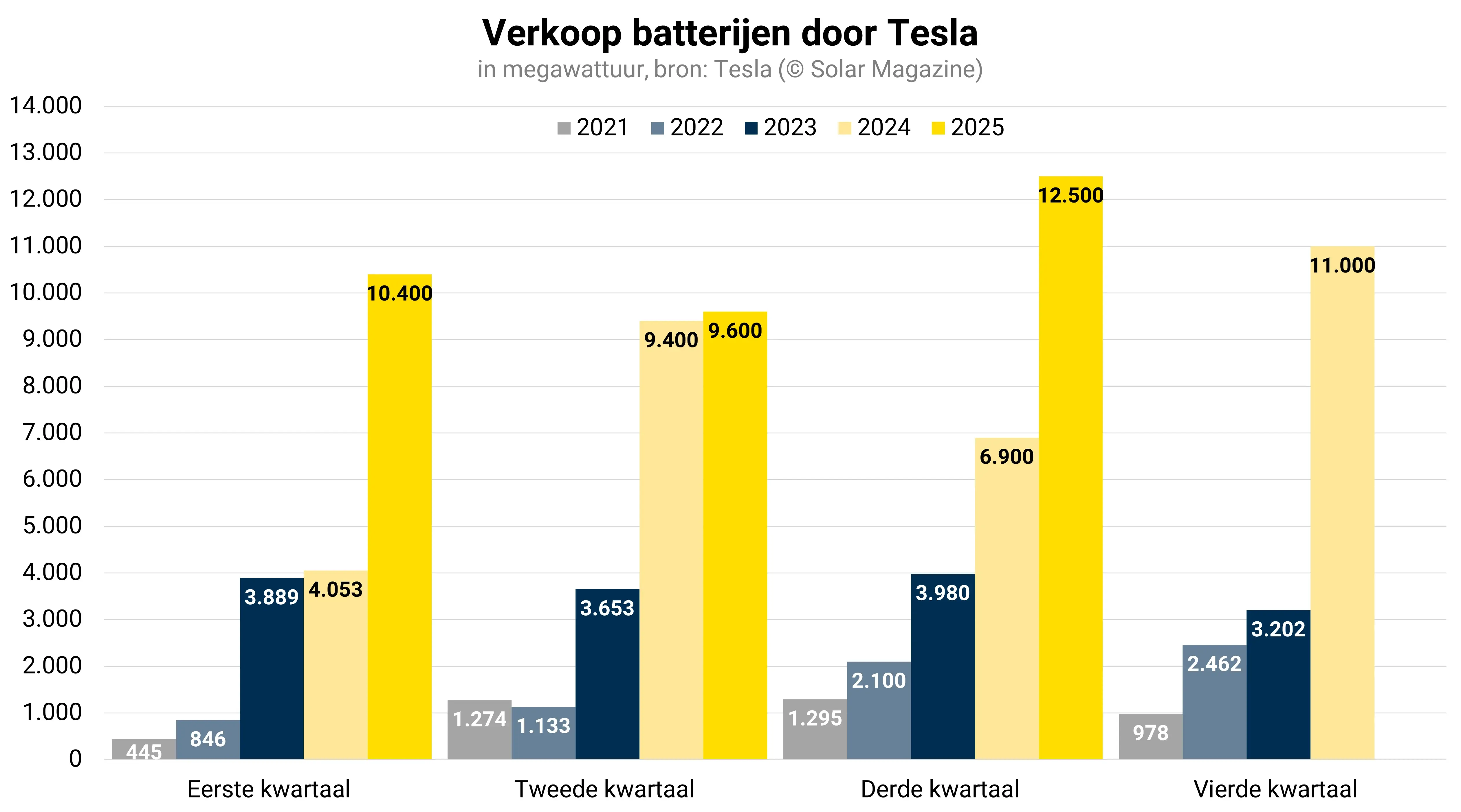 De 12,5 gigawattuur aan uitgeleverde energieopslagcapaciteit markeert een absoluut record voor Tesla. Dit bestaat uit zowel thuisbatterijen Powerwall als de zakelijke opslagsystemen Megapack.