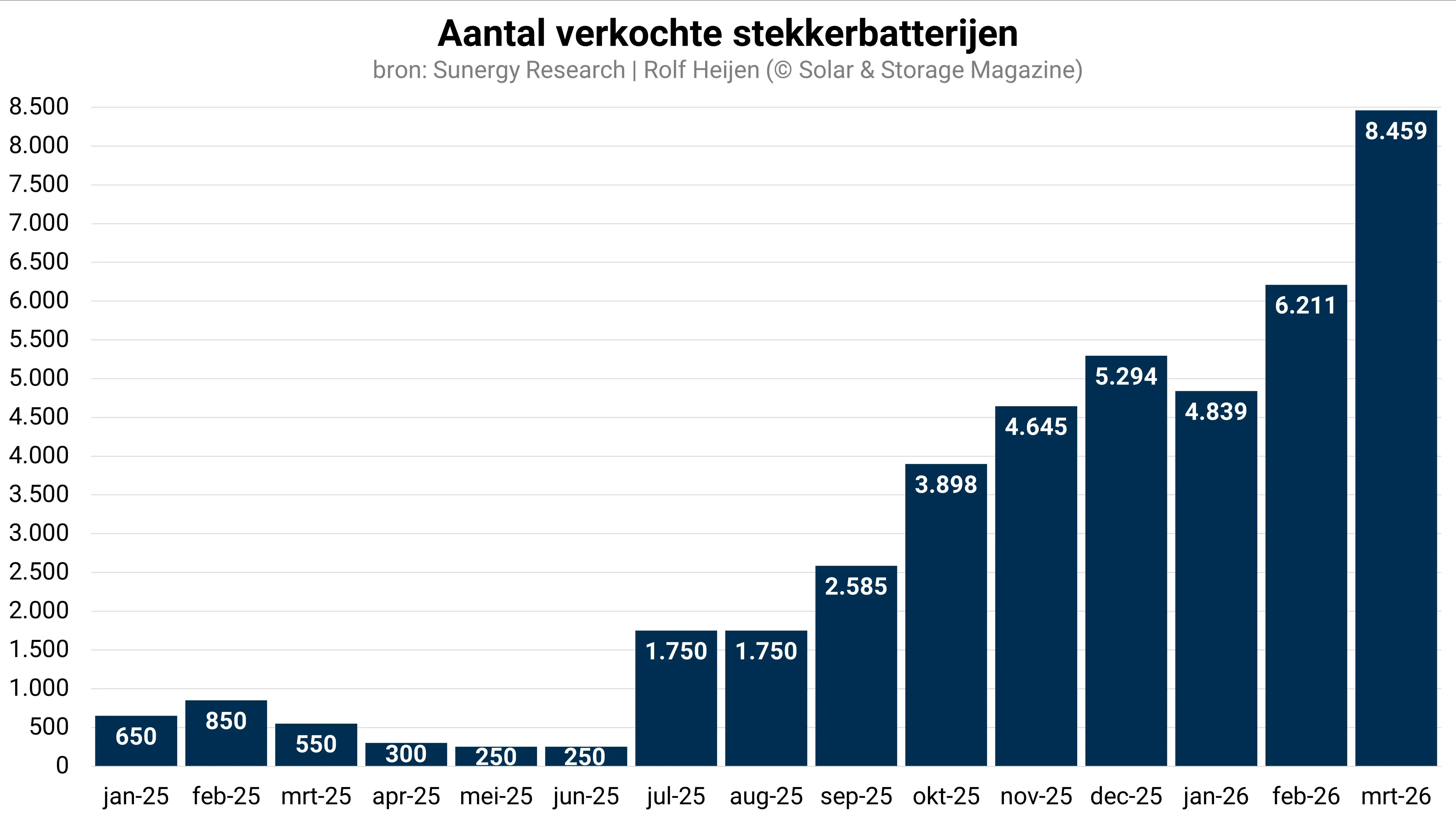 De cijfers tonen een explosieve groei in de eerste 3 maanden van het kalenderjaar. In januari 2025 werden nog 650 systemen verkocht en in maart 2026 lag dat aantal al ruim 13 keer hoger. Ook februari liet een forse stijging zien: in die maand werden 6.211 stekkerbatterijen geïnstalleerd, een toename van 28 procent ten opzichte van januari 2026.